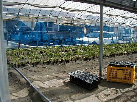 植え付けた親株から出たランナーを小型の円錐形ポットで受けています。小型ポットの特徴は使用する培土の量が少ないので、